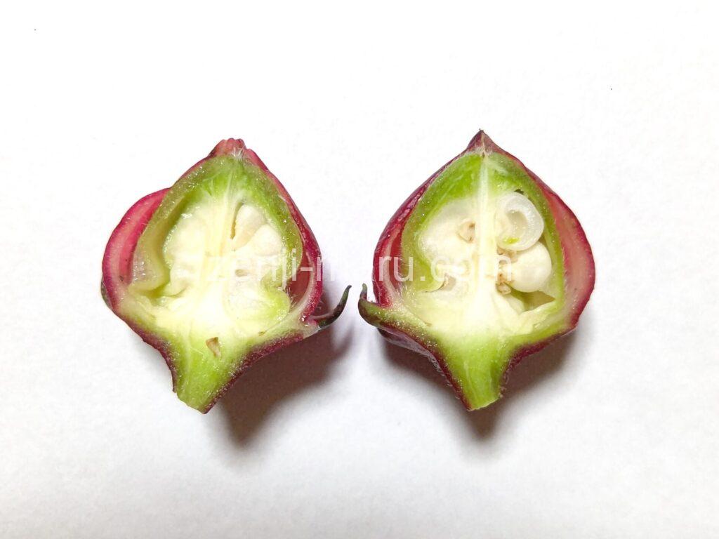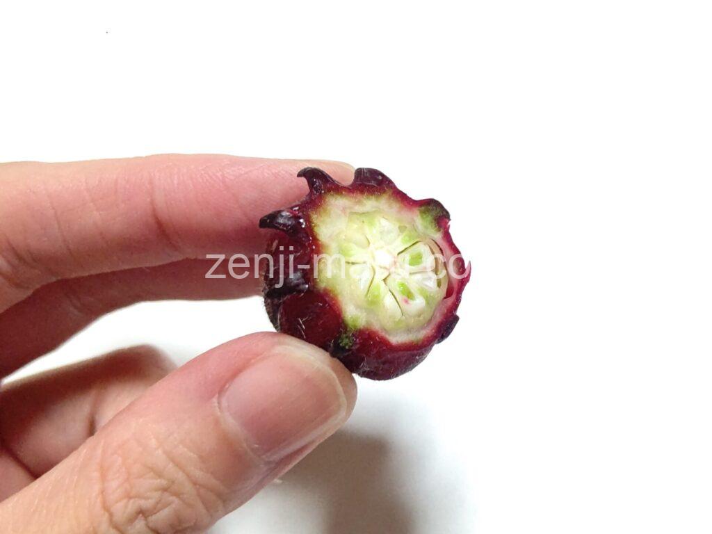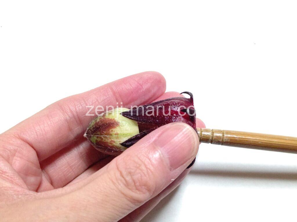 萼の近くを輪切りにして、そこから菜箸を差し込むと実がコロンと出てきます。