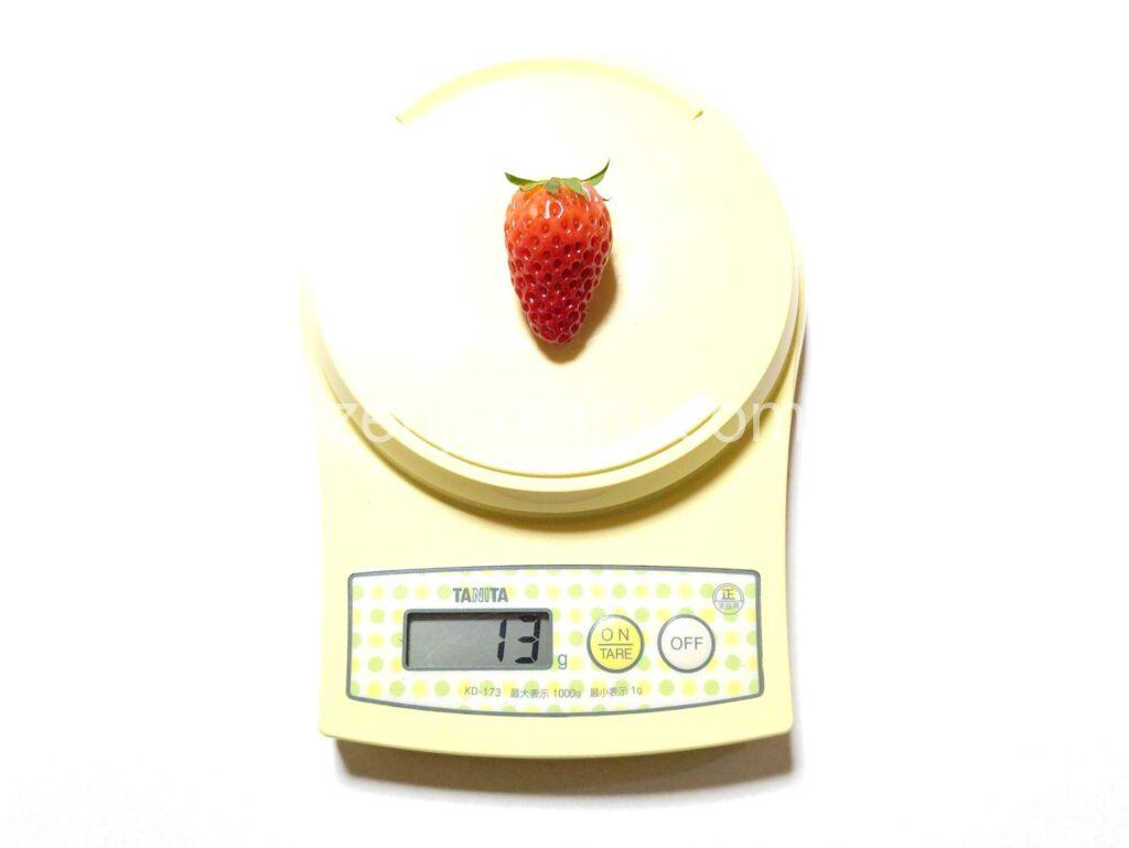 いちごは15g前後が標準的サイズなので、ちょうどそれにあてはまります。章姫についてはこれよりずっと大きい 50g以上のものもときどき見かけました。