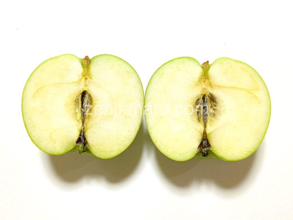 今回の果実は芯カビが入っていました。購入者は気にするところですが、芯の部分を取ってしまえばふつうに生で食べられます。ブラムリーはとても酸っぱいですが、芯カビは食味が良い品種によく発生します。