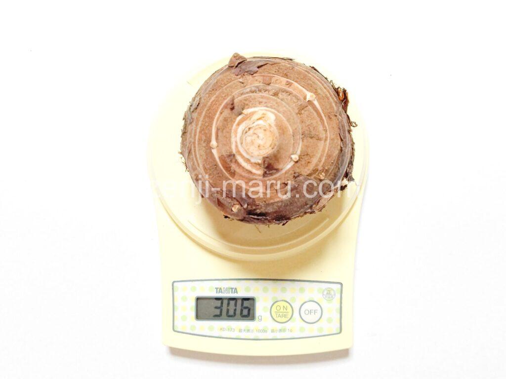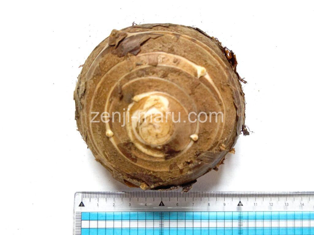 冬に出回る里芋の仲間です。子芋の縞模様や湾曲した形から「海老芋」と呼ばれます。このたび購入したものは親芋なので丸い形をしています。里芋の仲間の親芋を「頭芋(かしらいも)」といいますが、とくに海老芋の頭芋は「殿芋(とのいも)」と呼ばれます。海老芋は京野菜として有名です。ところが生産量は静岡が最も多いです。