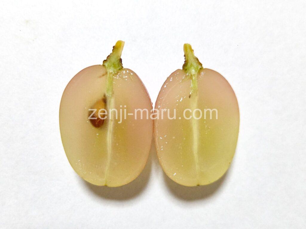 皮は酸っぱ苦いです。巨峰のように果皮が厚ければ手で剥いてしまうのだけど、甲斐路はどちらかというと薄いほう。なのでデラウェアのように口の中で皮を分離するのが良さそうです。果汁は甘い香りですがとても淡いです。果肉は崩れやすく、やさしい甘味と食感です。
