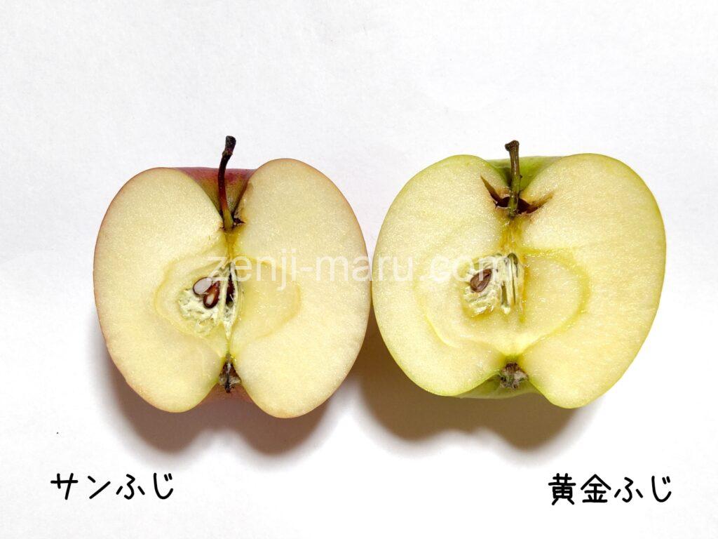 外皮の固さ・果肉の質感・甘味や酸味のバランス等は、サンふじとほぼ同じでした。