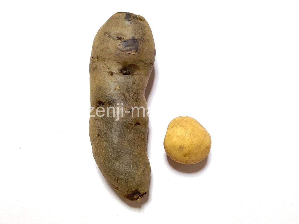 - 皮は濃い紫色でぼこぼこしていないが、ガサガサ組織に所々覆われている。他のどのじゃがいもにも似ていない。