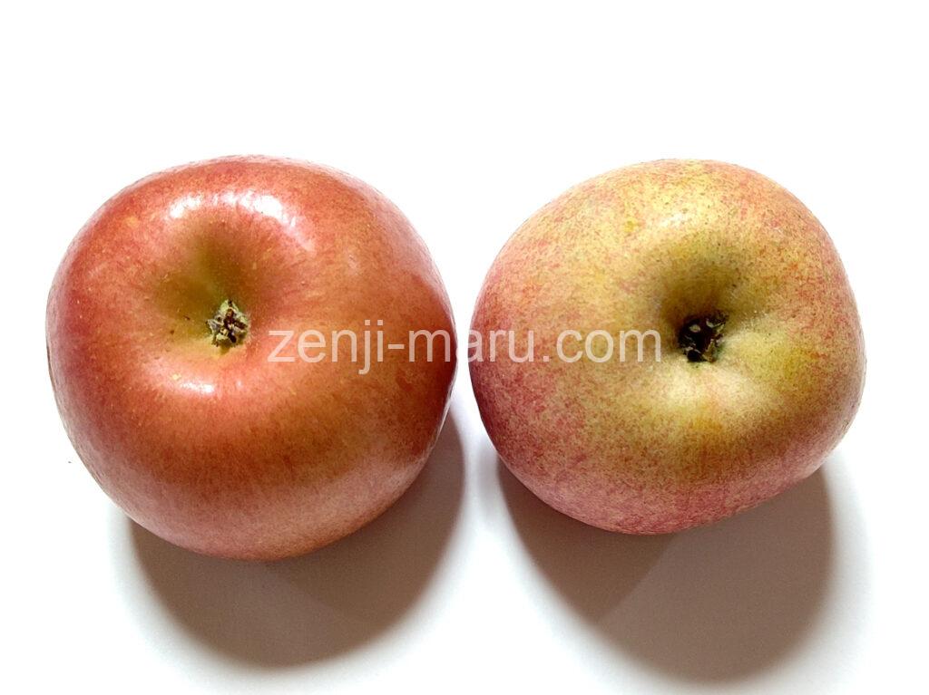 早生ふじのほうがマットな色合い。