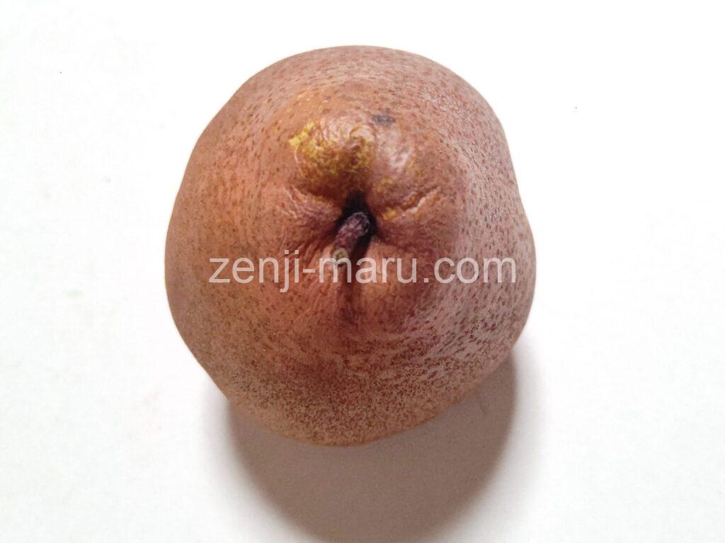 食べ頃になると、軸のあたりが柔らかく、果皮全体がこげ茶色のサビで覆われているのでやや見づらいですが、地の色が黄色くなります。