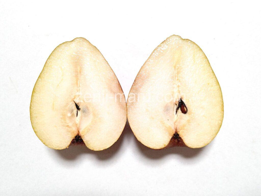 味が濃くてジャリジャリ感の強いラ・フランスといった感じです。果皮の香りは弱く、カットしてもそれほど強い香りは立ちません。果汁は爽やかなグリーンノート寄りです。口に含んではじめて芳醇な甘い香りを感じます。